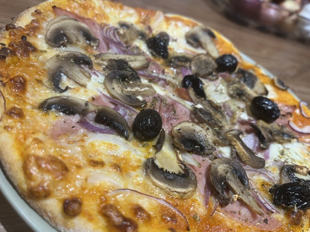 (tomate, mozzarella, jambon blanc, champignons, olives)